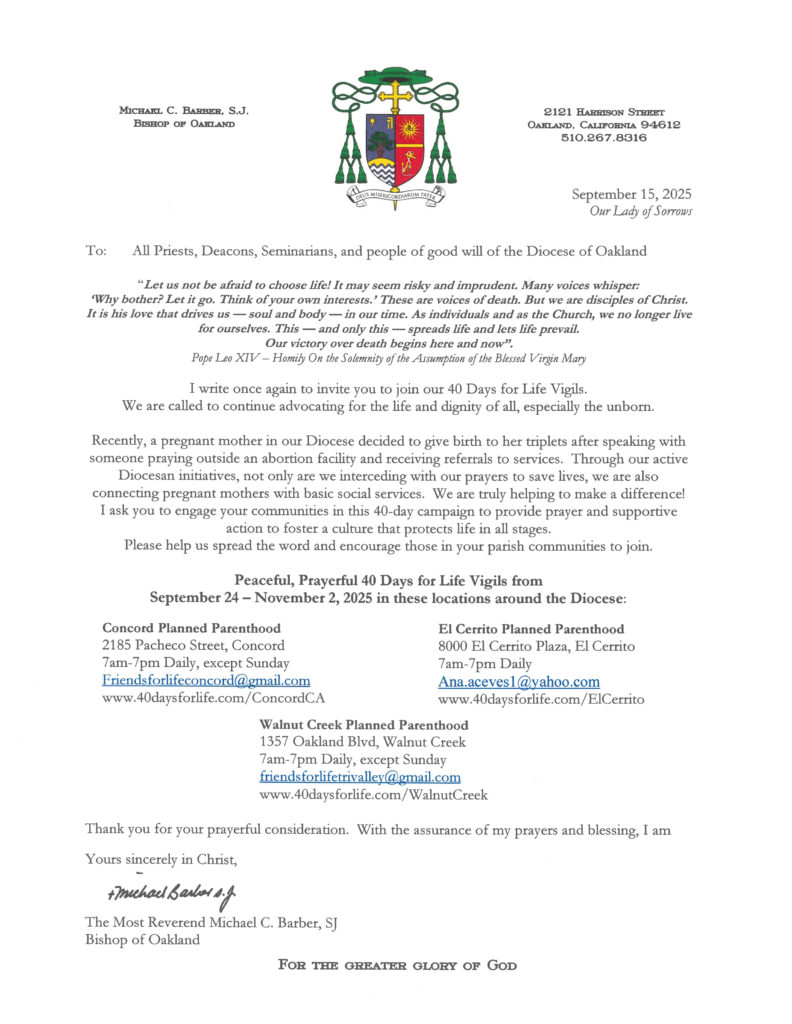 40 Days for Life is an internationally coordinated 40-day campaign that aims to end abortion locally through prayer and fasting, community outreach, and a peaceful all-day vigil in front of abortion businesses.