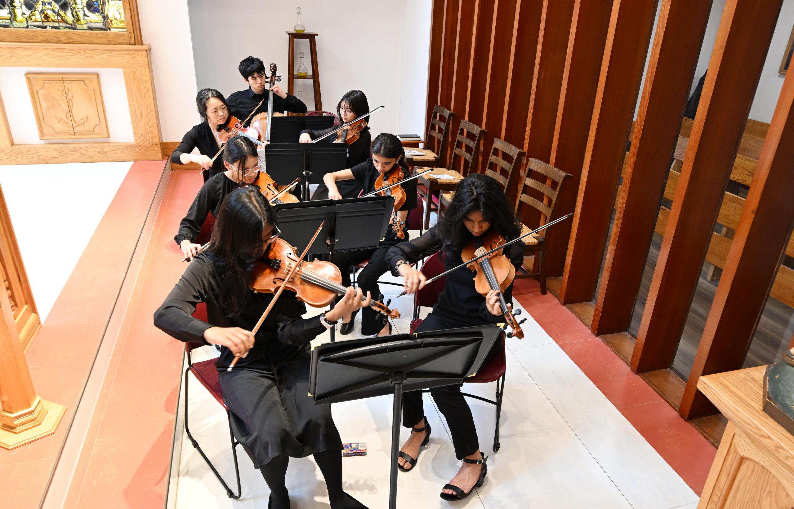 The St. Joseph youth group sent an altar cloth with their hand prints to the Guatemala parish. Here, the Santa Maria del Camino youth are painting an altar cloth for St. Joseph parish.