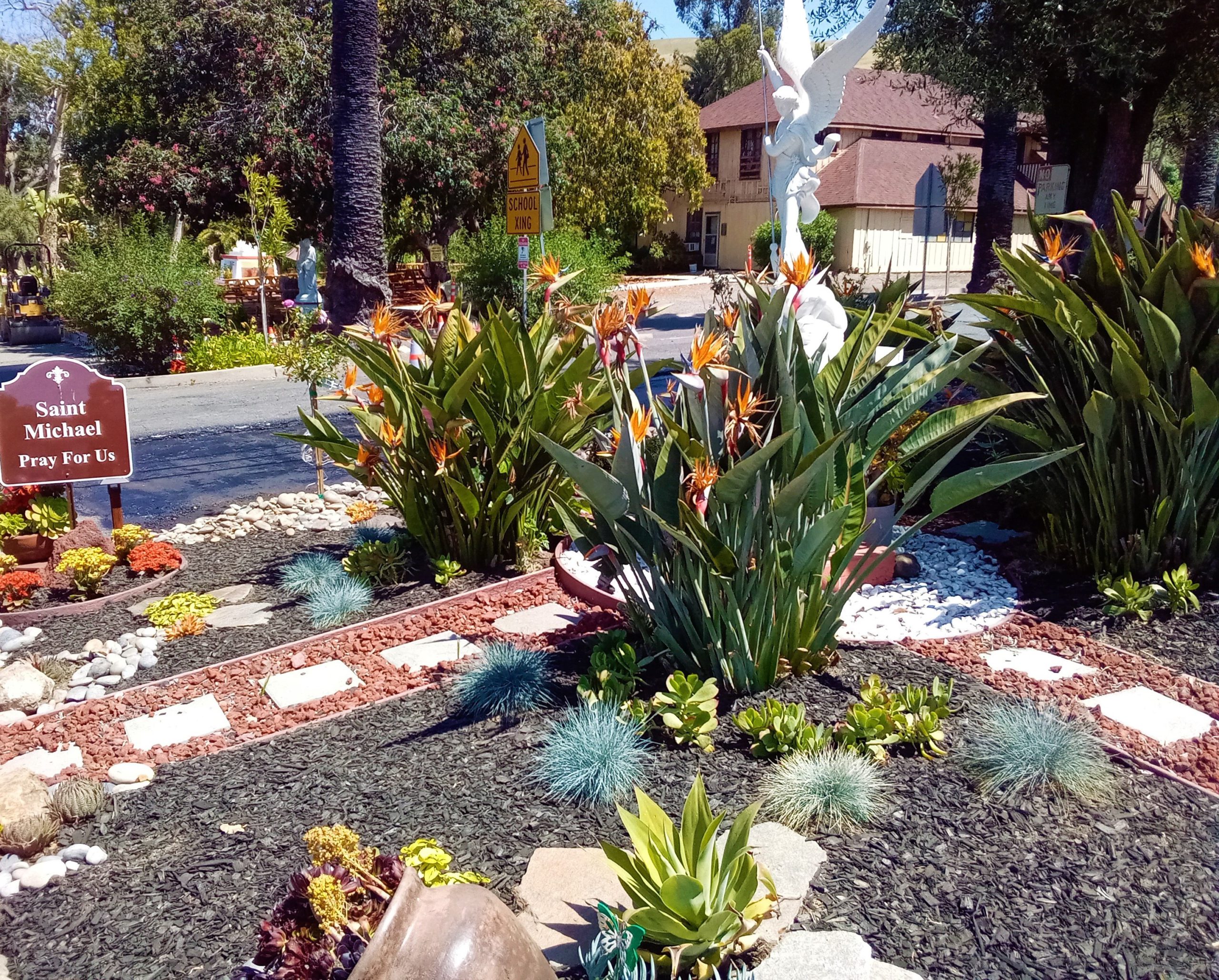 Landscaping a Forgotten Corner – The parish recently landscaped the southwest corner of the parking lot entrance from Mission Blvd next to the Mission cemetery entry gate. Stop by and admire the plants and heart made of stones.