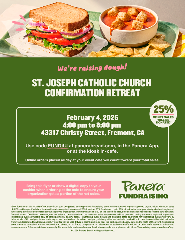 Panera Fundraising for Confirmation Retreat Your meal can help our confirmation students! 📅 Wednesday, February 04 ![]() ![]() ![]() Panera Fundraising for Confirmation Retreat |