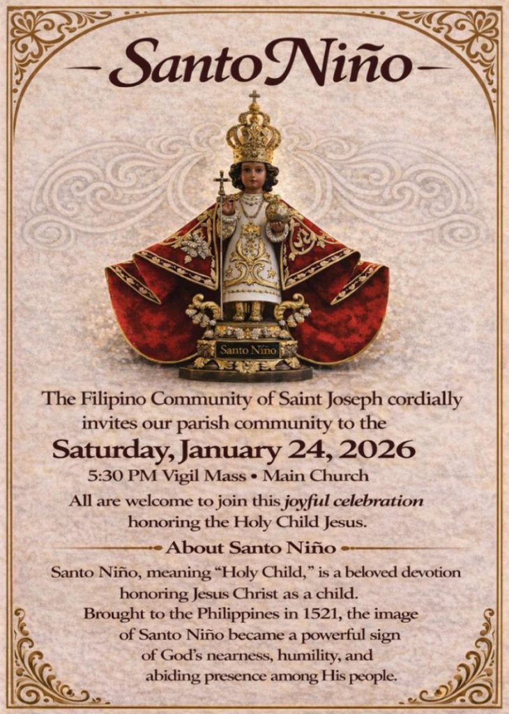 The Filipino Community of St. Joseph invites you to celebrate the Feast of Santo Niño, a cherished tradition of faith and devotion on Saturday, January 24, 2026. Holy Vigil Mass at 5:30 PM. Let us come together as one community to honor the Holy Child, Santo Niño, in a spirit of love, prayer and celebration.