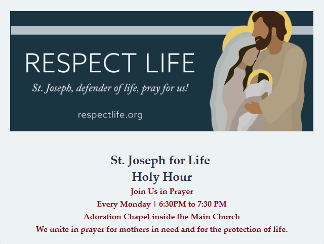 Join us every Monday from 6:30 PM to 7:30 PM in the Adoration Chapel for a peaceful and prayerful Holy Hour. Together, we will unite in prayer for mothers in need and for the protection of all life.