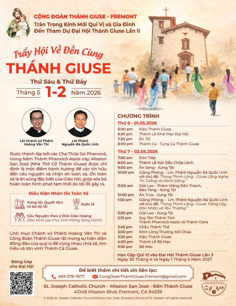 Trân trọng kính mời quý vị tham dự Đại Hội Thánh Giuse Lần II, một dịp thiêng liêng để cùng nhau đào sâu đời sống nội tâm theo gương Thánh Cả Giuse—một người âm thầm, vâng phục và hoàn toàn tín thác nơi Thiên Chúa.
