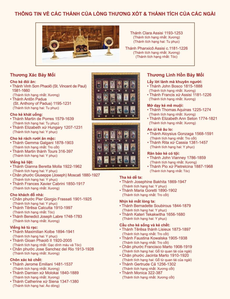 Các thánh tích sẽ bao gồm nhiều vị thánh tiêu biểu cho các việc thương xác và thương linh hồn, như:
